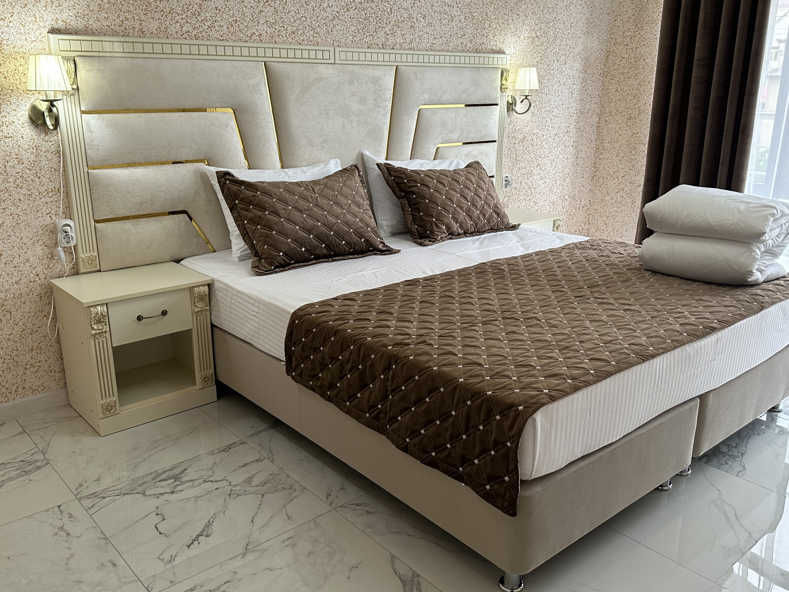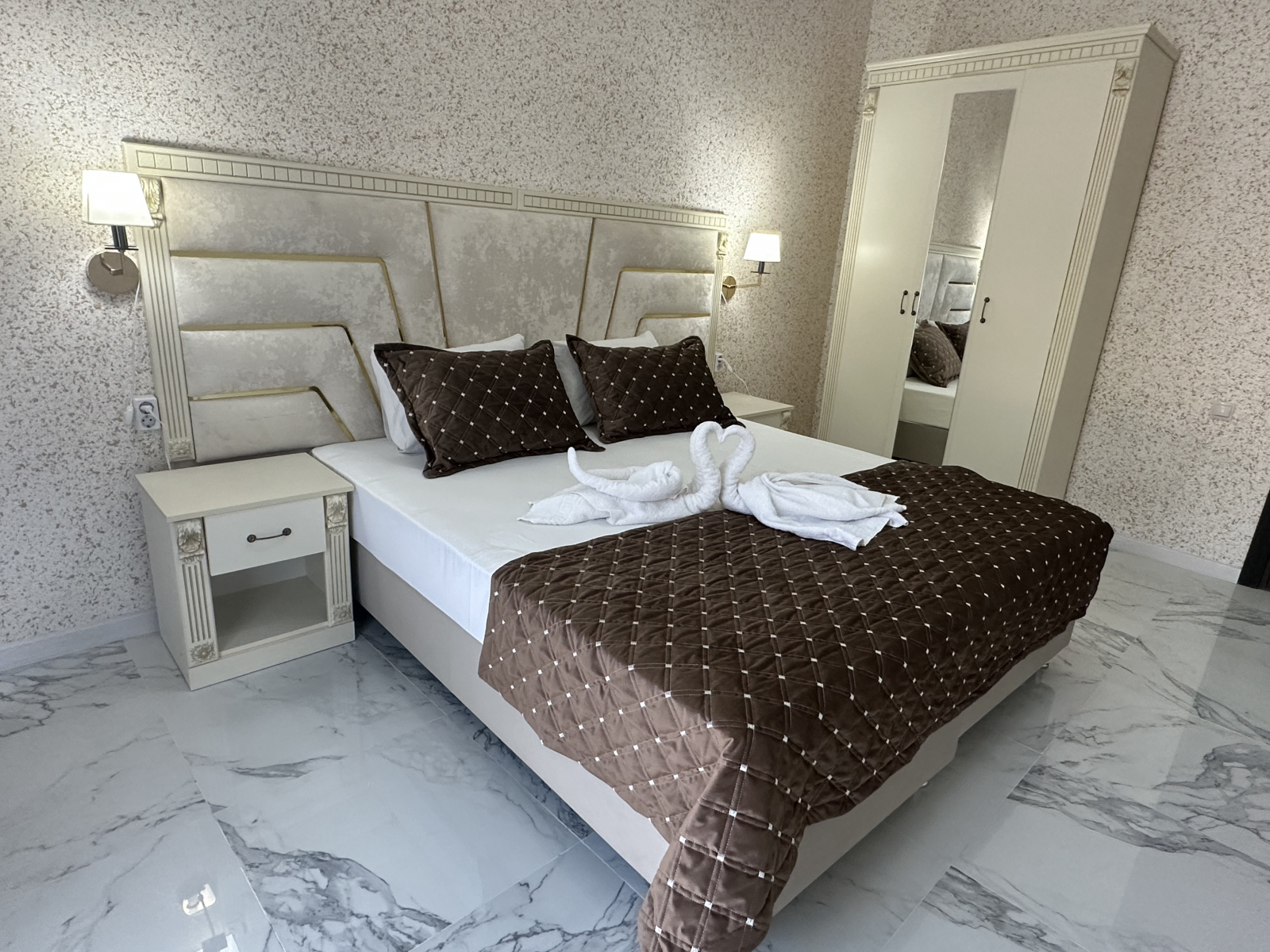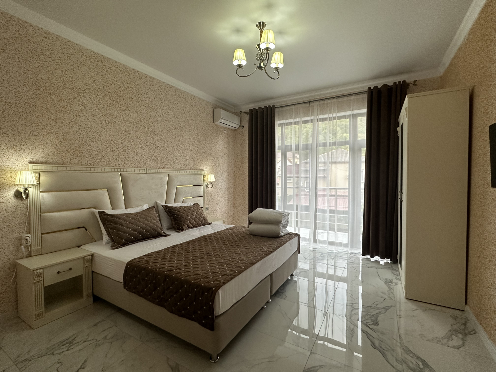 2 осн. места. 2 доп. места. Мебель: вешалка, диван раскладной, зеркало, кресла, кровать двуспальная, кухонная мебель, прикроватные тумбочки, стол, стулья, шкаф. Мини-кухня. Оборудование: кондиционер, набор посуды, телевизор, холодильник, электрочайник. Санузел: с душем, туалетные принадлежности, фен. Сервис: Wi-Fi бесплатно, смена полотенец, смена постельного белья, уборка номера.