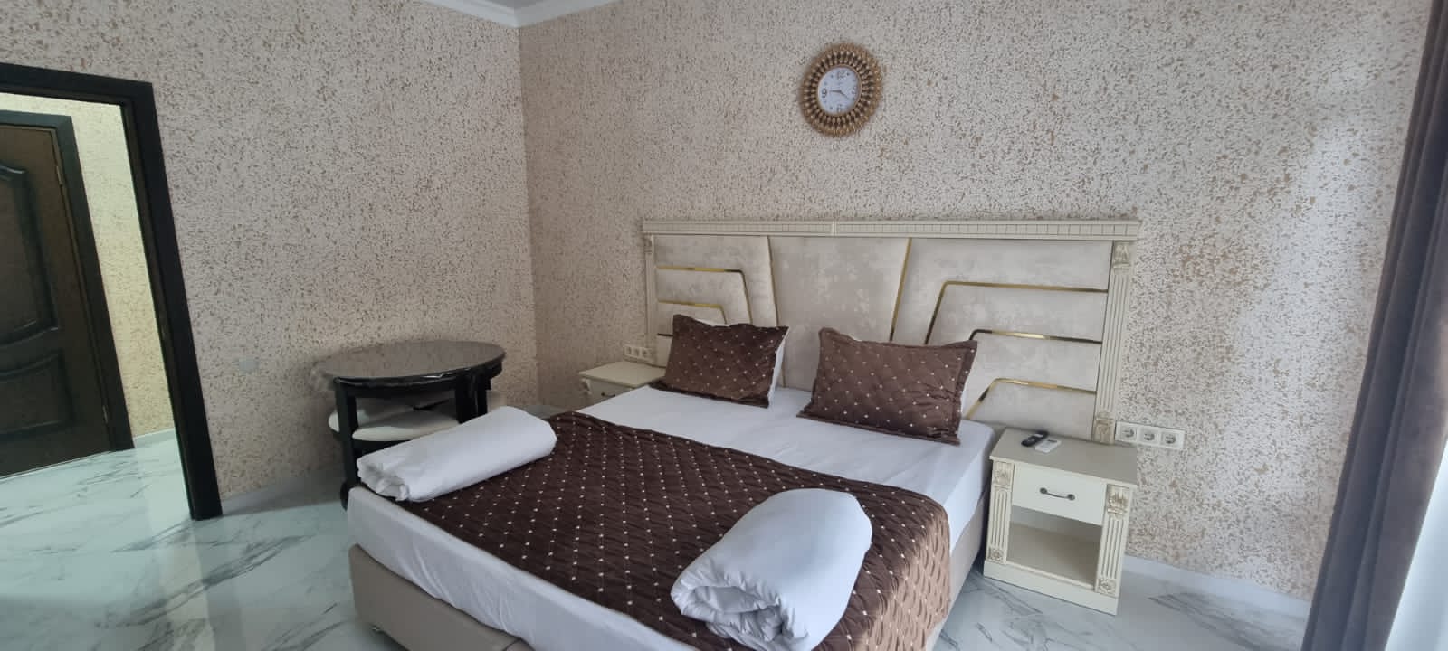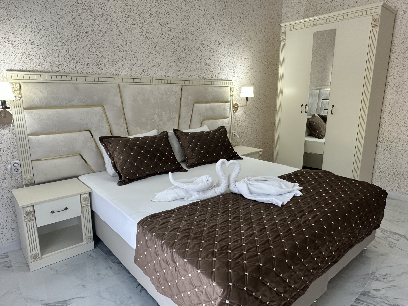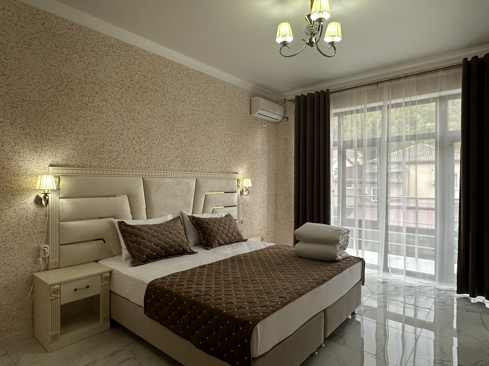 2 осн. места. 2 доп. места. Мебель: вешалка, диван раскладной, зеркало, кресла, кровать двуспальная, кухонная мебель, прикроватные тумбочки, стол, стулья, шкаф. Мини-кухня. Оборудование: кондиционер, набор посуды, телевизор, холодильник, электрочайник. Санузел: с душем, туалетные принадлежности, фен. Сервис: Wi-Fi бесплатно, смена полотенец, смена постельного белья, уборка номера.