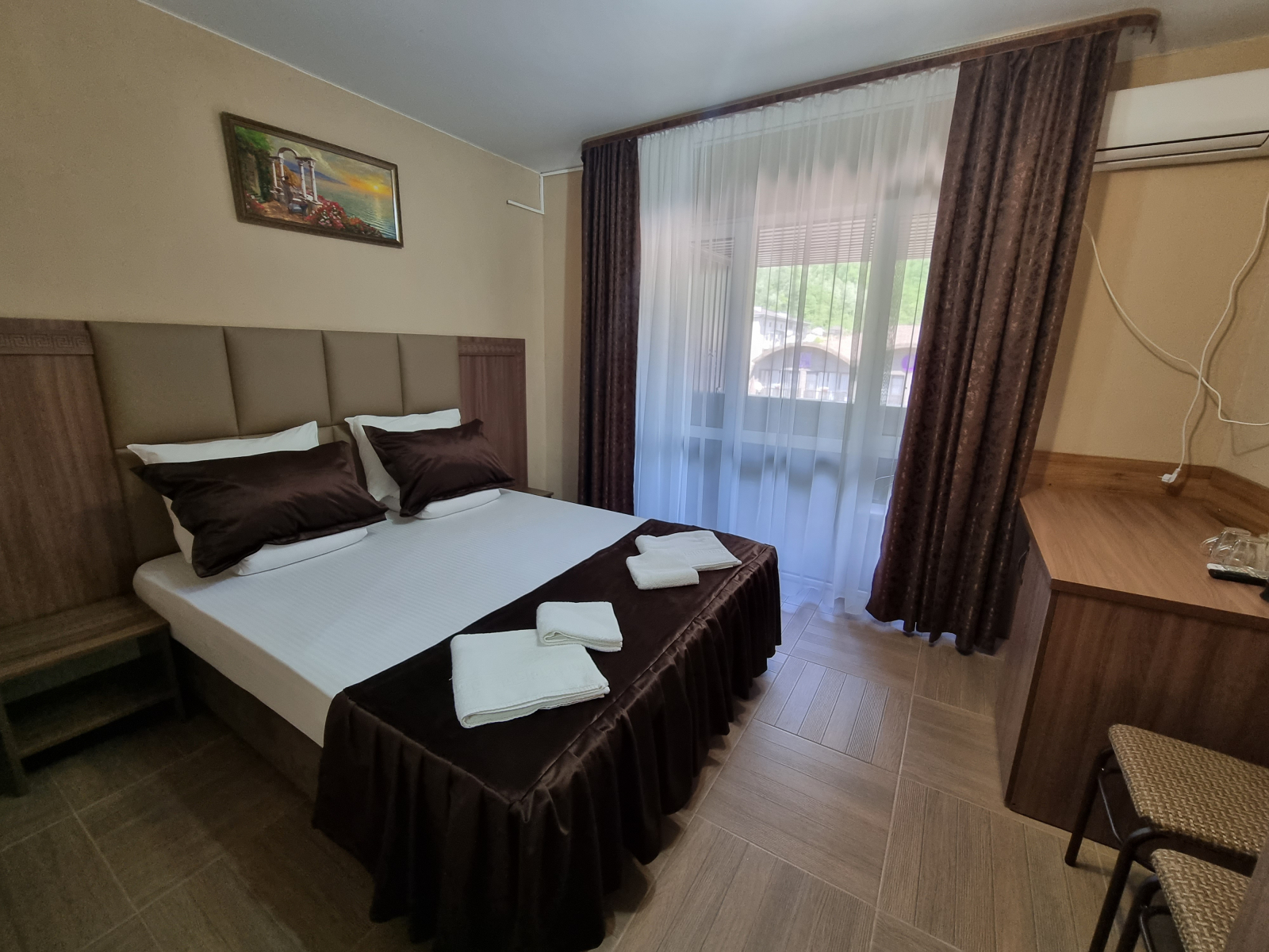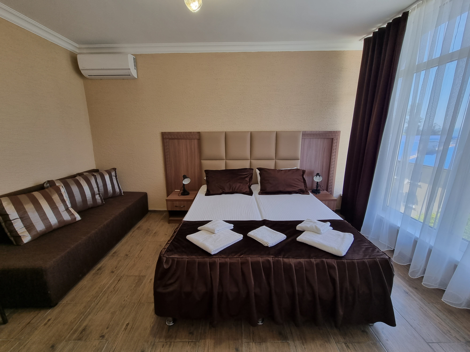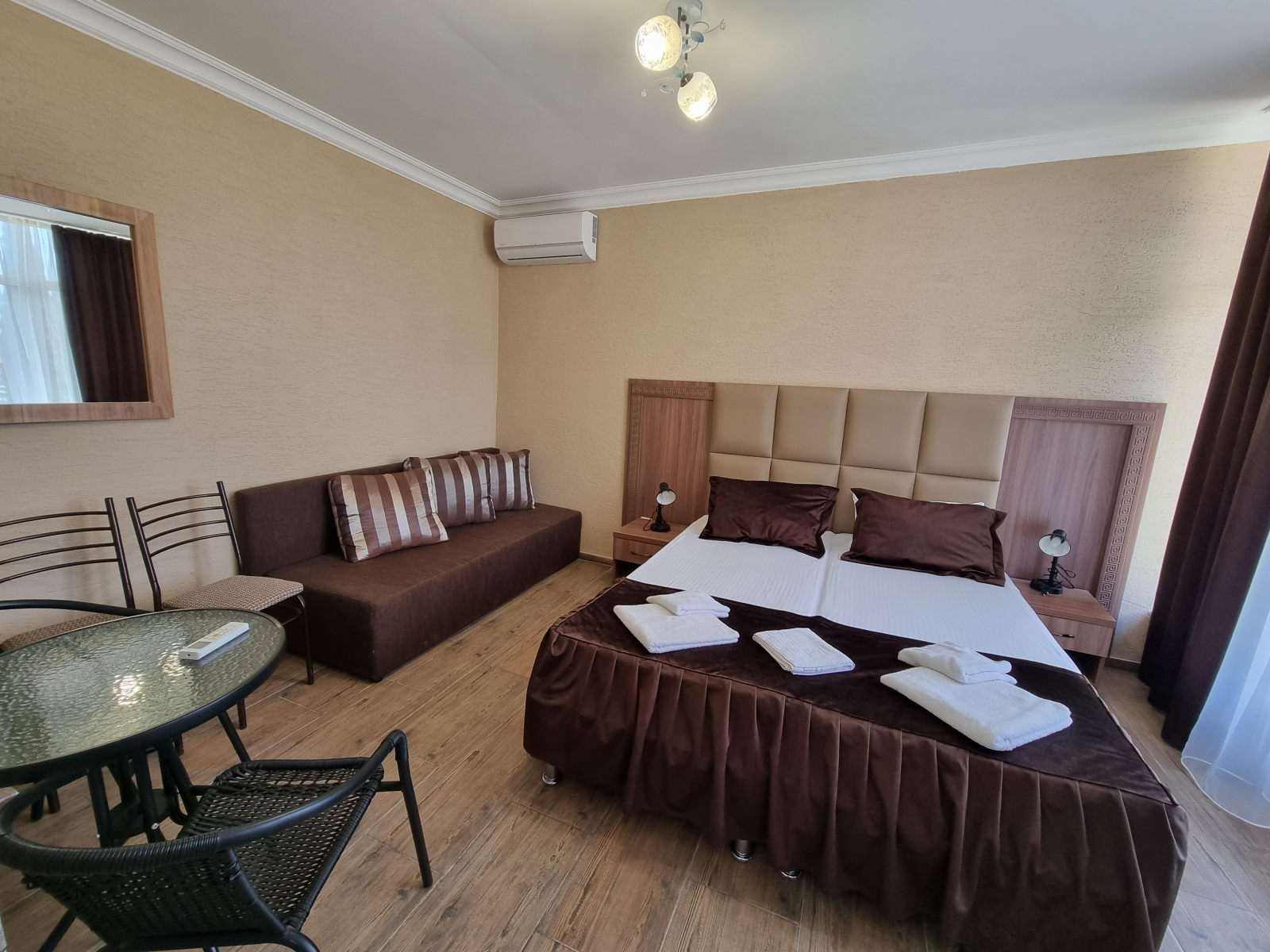 3 осн. места. 1 доп. место. Мебель: вешалка, зеркало, кровати односпальные /одна двуспальная кровать, кровать односпальная (или диван), прикроватные тумбочки, стол, стул, шкаф. Оборудование: кондиционер, телевизор, холодильник. Санузел: с душем, туалетные принадлежности, фен. Сервис: Wi-Fi бесплатно, смена полотенец, смена постельного белья, уборка номера.